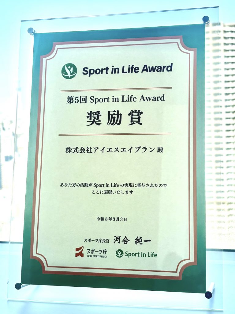 株式会社アイエスエイプランは、スポーツ庁がスポーツ人口の拡大に貢献する優れた取り組みを表彰する「Sport in Lifeアワード」にて、奨励賞を受賞しました。