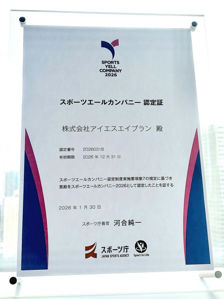 株式会社アイエスエイプランは、スポーツ庁がスポーツ活動の支援や促進に向けた取り組みを実施している企業を認定する「スポーツエールカンパニー」に認定されております。