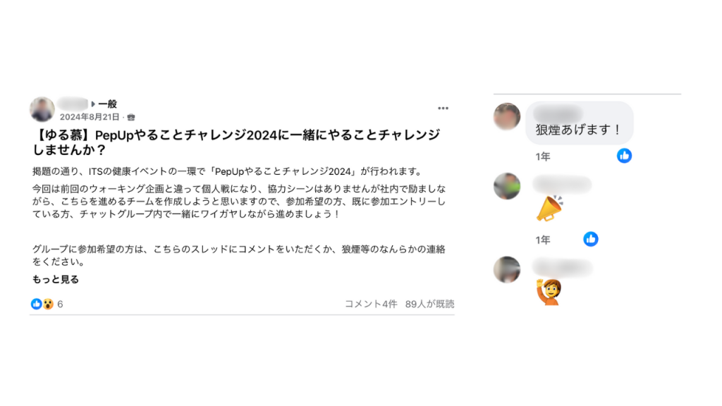 健康イベントの参加者募集や、アカウントにログインできないときの相談など、気軽な話題から真剣な話題まで、幅広い交流が生まれていました。